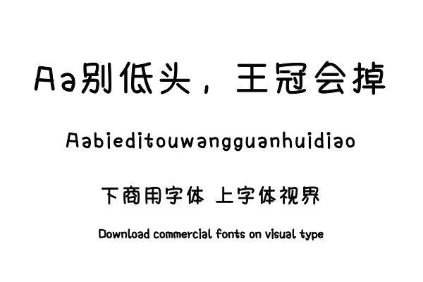 Aa别低头,王冠会掉是一款POP结构风格的字体。笔划稍细,笔画简洁,字形饱满,负空间大。整体效果活泼有个性,但又不失稳定且适读。作为标题正文均可,适用场景广泛。购买须知:“下载服务费”与“字体VIP”所获得字体 仅用于个人非商用, 商用请联系付费授权。本字体为电脑用字,手机没有root权限不支持直接手机换字(手机如何root,请自行百度搜索教程)。购买前请先 了解清楚后再付款 ,字体为虚拟产品无法回收 一旦购买不支持退款。