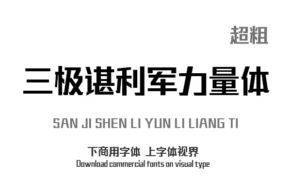 字体视界是一家专业字体授权平台,平台已取得「三极谌利军力量体 超粗」字体的官方代理授权,并有权为您提供字体授权服务。除了「三极谌利军力量体 超粗」字体以外字体视......购买须知:“下载服务费”与“字体VIP”所获得字体 仅用于个人非商用, 商用请联系付费授权。本字体为电脑用字,手机没有root权限不支持直接手机换字(手机如何root,请自行百度搜索教程)。购买前请先 了解清楚后再付款 ,字体为虚拟产品无法回收 一旦购买不支持退款。