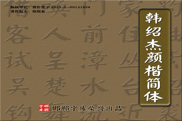 字体视界™是正版商用字体授权平台,平台已取得「韩绍杰颜楷简体」字体的官方授权,并有权为您提供字体授权服务。除了「韩绍杰颜楷简体」字体以外字体视界™还提供邯郸字库......单字授权