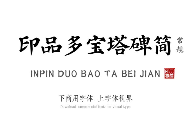 《印品多宝塔碑简》字体故事 《印品多宝塔碑简》制作源于唐代书法家颜真卿的《多宝塔碑》,全称《大唐西京千福寺多宝佛塔感应碑》,该碑字是颜真卿“颜体”楷书的初步形成阶段的代表作之一。 在做这款字之前,设计师查阅了大量的关于多宝塔碑图文史载,在一定的了解后总结得出:多宝塔碑用笔多用中锋,起笔和收笔有明显的顿按,竖画粗壮,横、竖笔画粗细对比鲜明,撇画较轻盈挺健,捺画却粗壮有力,字型稍方,端庄平稳。在保持这些基本特征不变并不影响辨识度的情况下,我将碑字中的传统笔画特色与现今简体字笔画结构结合,使其既保留了颜公笔法风骨精髓,又便于现代人阅读使用。后增添符号设计,完成简体7753字符集。 设计师感受:制作完成这款《印品多宝塔碑简》在提升我本身对字体的了解的同时也使我深刻感受到颜公书法之精妙,字体作为中国传统文化瑰宝之厚重。所以在成就自己的同时更希望这是一次对颜真卿书法的致敬与发展,中国传统字体的传承与发扬。