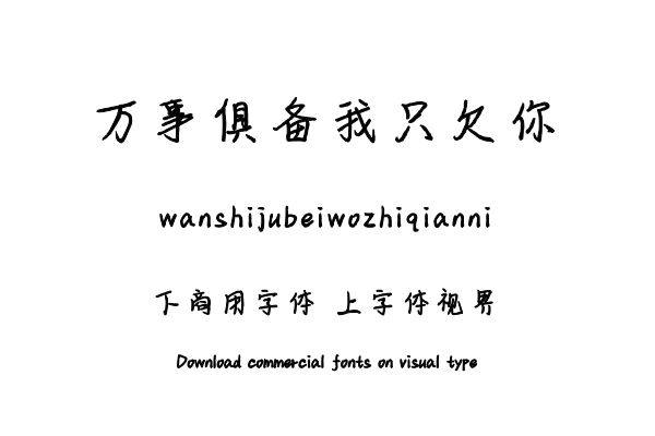 字体视界™是正版商用字体授权平台,平台已取得「万事俱备我只欠你」字体的官方授权,并有权为您提供字体授权服务。除了「万事俱备我只欠你」字体以外字体视界™还提供文道......单字授权
