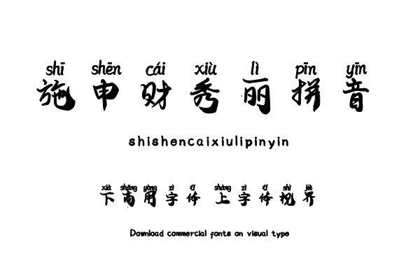 字体视界™是正版商用字体授权平台,平台已取得「施申财秀丽拼音」字体的官方授权,并有权为您提供字体授权服务。除了「施申财秀丽拼音」字体以外字体视界™还提供施申财字......单字授权