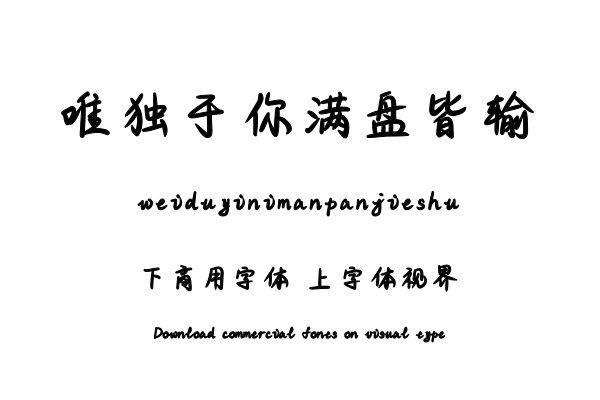 字体视界™是正版商用字体授权平台,平台已取得「唯独于你满盘皆输」字体的官方授权,并有权为您提供字体授权服务。除了「唯独于你满盘皆输」字体以外字体视界™还提供文道......单字授权