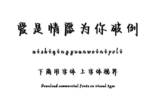 字体视界™是正版商用字体授权平台,平台已取得「爱是情愿为你破例」字体的官方授权,并有权为您提供字体授权服务。除了「爱是情愿为你破例」字体以外字体视界™还提供字语......单字授权