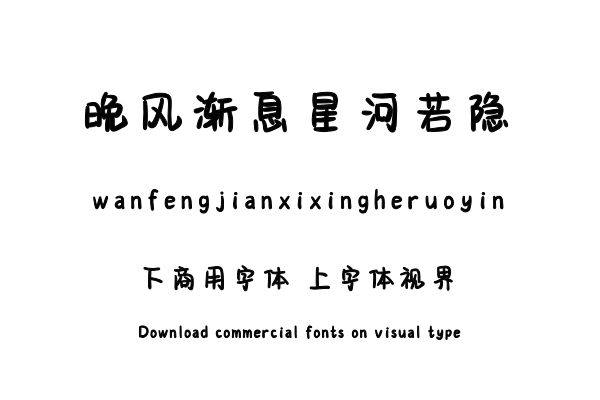 字体视界™是正版商用字体授权平台,平台已取得「晚风渐息星河若隐」字体的官方授权,并有权为您提供字体授权服务。除了「晚风渐息星河若隐」字体以外字体视界™还提供文道......单字授权