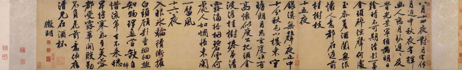 《八月十四夜对月有作》月近中秋夜有辉,幽人恋月卧迟迟。及旹光景宁须满,明日阴晴不可期。清影一帘金琐碎,凉声何䖏玉㕘差。酒阑无限怀人意,都在庭前桂树枝。《十五夜》银汉无声夜正中,十分秋色小楼东。空瞻朗月思玄度,谁有高怀似庾公。把酒金波浮桂树,卷帘清露滴梧桐。碧云何处人如,惆怅东阑一笛风。《十六夜》入眼氷轮积渐摧,白头顾影重徘徊。极知物理盈当缺,自惜流年去不来。蟋蟀早将寒气至,芙蓉都受露华开。殷勤不负花前意,依旧清光在酒杯。徵明