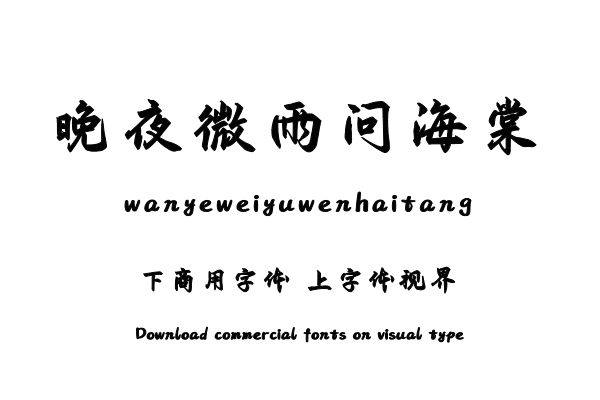 字体视界™是正版商用字体授权平台,平台已取得「晚夜微雨问海棠」字体的官方授权,并有权为您提供字体授权服务。除了「晚夜微雨问海棠」字体以外字体视界™还提供文道字库......单字授权