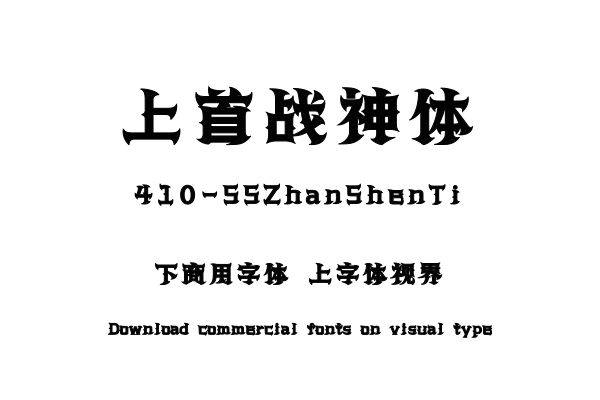 No.410-上首战神体.ttf:来自字体视界,由字体视界负责对外发布和商业授权服务。购买须知:“下载服务费”与“字体VIP”所获得字体 仅用于个人非商用, 商用请联系付费授权。本字体为电脑用字,手机没有root权限不支持直接手机换字(手机如何root,请自行百度搜索教程)。购买前请先 了解清楚后再付款 ,字体为虚拟产品无法回收 一旦购买不支持退款。