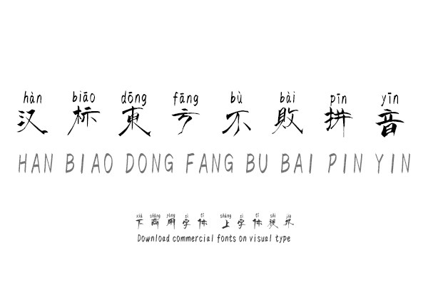 本款字是在《汉标东方不败》字体基础上做的拼音字体。《汉标东方不败》基于隶书风格字体,既遒劲有力又不失文雅风韵的特色隶书体。作者运用多种书法技巧书写,集数年所学及......单字授权