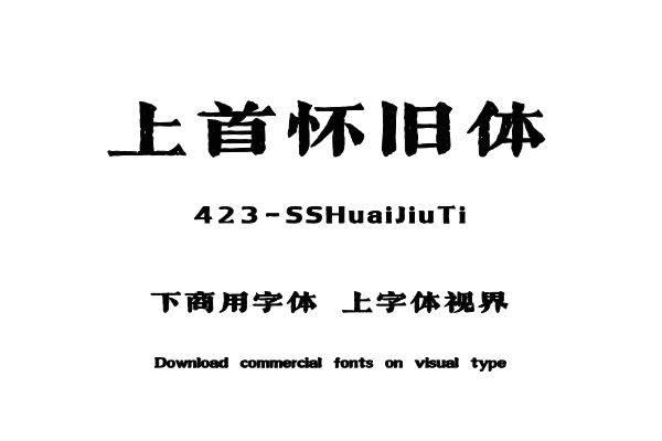 No.423-上首怀旧体.ttf :来自字体视界,由字体视界负责对外发布和商业授权服务。购买须知:“下载服务费”与“字体VIP”所获得字体 仅用于个人非商用, 商用请联系付费授权。本字体为电脑用字,手机没有root权限不支持直接手机换字(手机如何root,请自行百度搜索教程)。购买前请先 了解清楚后再付款 ,字体为虚拟产品无法回收 一旦购买不支持退款。