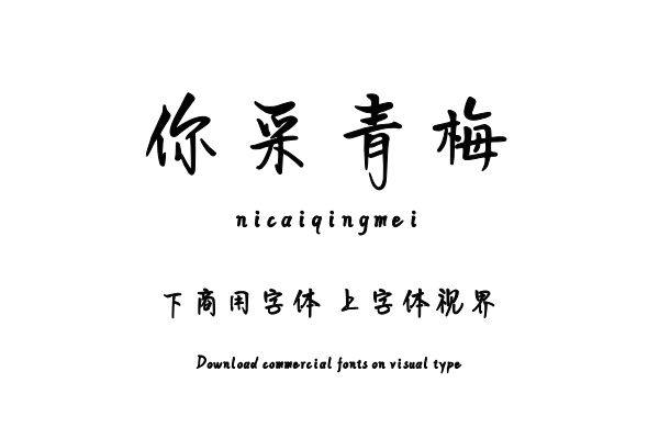 字体视界™是正版商用字体授权平台,平台已取得「你采青梅」字体的官方授权,并有权为您提供字体授权服务。除了「你采青梅」字体以外字体视界™还提供字语坊字库字库其他字......单字授权
