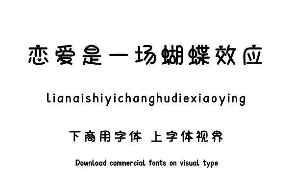 字体视界™是正版商用字体授权平台,平台已取得「恋爱是一场蝴蝶效应」字体的官方授权,并有权为您提供字体授权服务。除了「恋爱是一场蝴蝶效应」字体以外字体视界™还提供......单字授权
