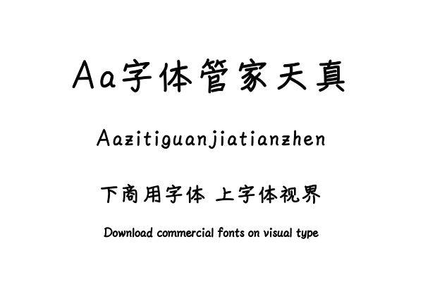天真是一款看起来有些稚嫩的手写体,模仿小学刚刚学习写字时稚嫩的一笔一划书写的感觉。富有童趣,仿佛能感受到书写时认真的画面,让人回想起儿时的学习时光。购买须知:“下载服务费”与“字体VIP”所获得字体 仅用于个人非商用, 商用请联系付费授权。本字体为电脑用字,手机没有root权限不支持直接手机换字(手机如何root,请自行百度搜索教程)。购买前请先 了解清楚后再付款 ,字体为虚拟产品无法回收 一旦购买不支持退款。