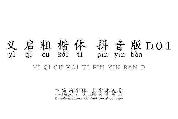 《义启粗楷体 拼音版D01》此字库为《义启粗楷体 拼音版U》的子集字库(ttf格式)。需要下载完整字体,请点击这里前往《义启粗楷体 拼音版D》下载完整的字库集(“TTC”格式)。《义启粗楷体 拼音版D》一套完成的字库集包含了6款不同拼音的字库(分别为:《义启粗楷体 拼音版D01》、《义启粗楷体 拼音版D02》、《义启粗楷体 拼音版D03》、《义启粗楷体 拼音版D04》、《义启粗楷体 拼音版D05》、《义启粗楷体 拼音版D06》详见上方列表),每个子字库集的特征如下: