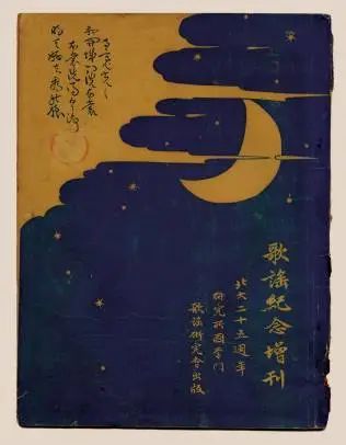 这本书收录了很多歌谣和关于歌谣的论文,虽然作者不是鲁迅,但是封面是他设计的,底色为深蓝色,表示月夜。几缕淡淡的闲云,一钩斜月。左上角是沈尹默的手迹,写的是一首儿歌《月亮光光》。右下角是鲁迅的笔迹:“歌谣纪念增刊北大二十五周年研究所国学门歌谣研究会出版”。其实这不就是典型的对角线构图嘛,整个画面给人一种幽雅、静谧的气质。