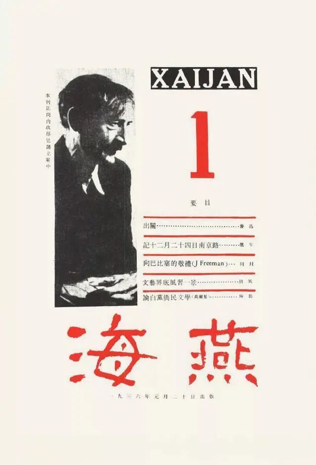 在 1936年 1 月 20 日,《海燕》第一期面世,整个封面设计和之前不一样了,是图文的搭配,一下就能看出鲁迅先生功力深厚,设计的目的就是美观快速的传递信息,他在这个封面上就兼顾了很多设计规则,比如两端对齐,为了避免出现太多留白和字号过大,先生的处理方式是用虚线链接,用红线分割,稳中有序,封面上红色的手写体 "海燕" 特别显眼。并且上线当日即告售罄,鲁迅在日记中专门记载此事,尤为兴奋。