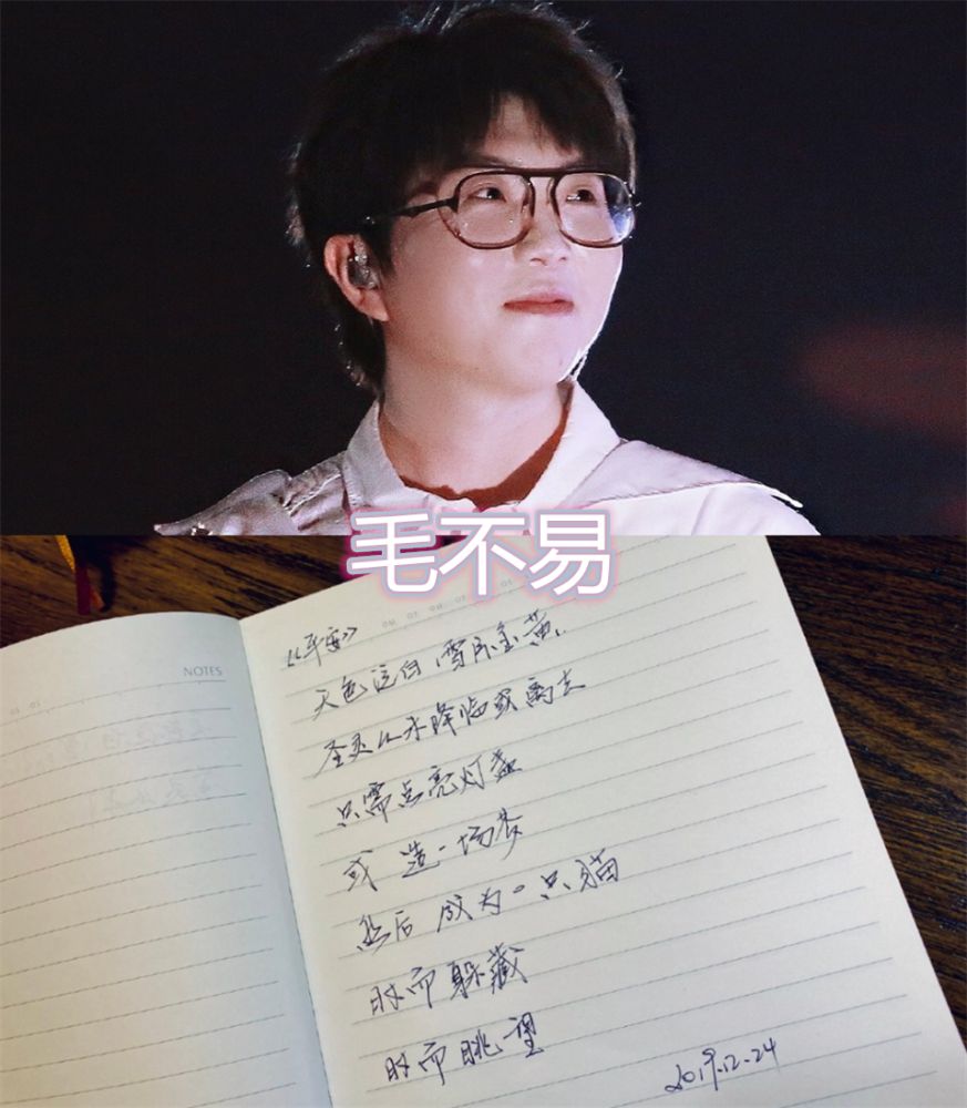 首先这个图中就是毛不易,这个大家都十分的熟悉了,也是相当厉害的音乐人,他参加选秀节目出道,虽然最开始上学的时候不是学习音乐的,但是本身就很有天赋,到现在的热度还是得很高的,作品也有不少,看图中所显示的就是这个男生的字体,看样子就是十分清秀的感觉还是很不错的。