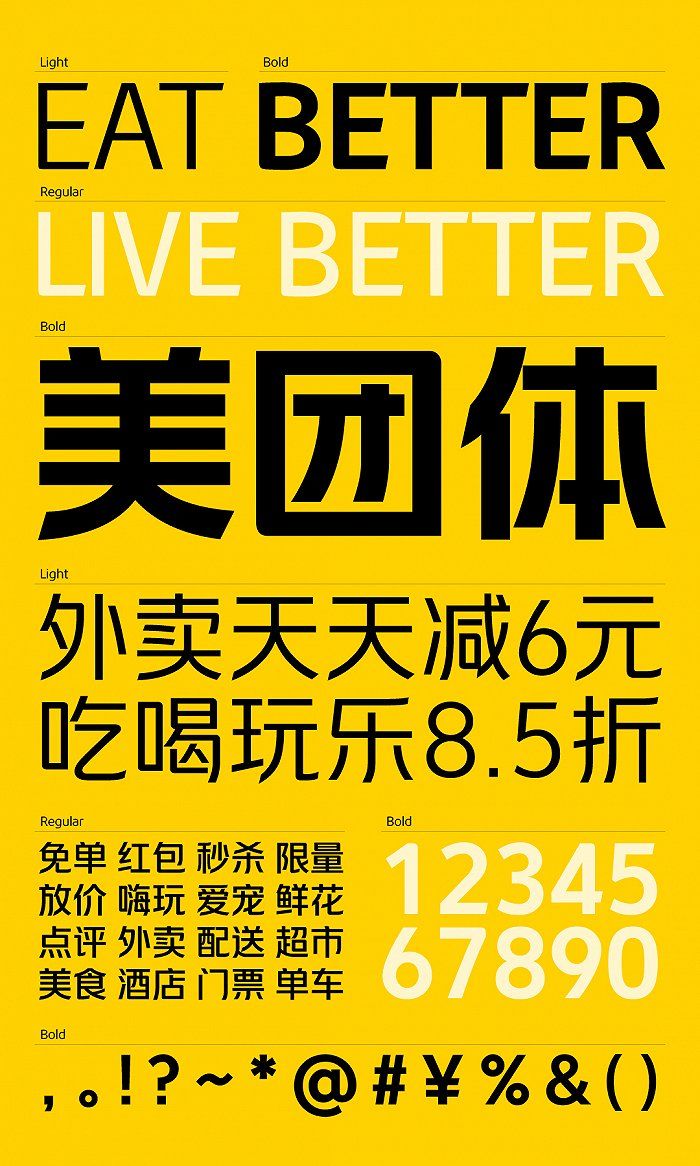 美团体共包含Light、Regular、Bold三个字重, 西文设计沿袭了汉字斜切+圆角的主要笔画特征,与中文搭配使用时具有一致的视觉识别性。