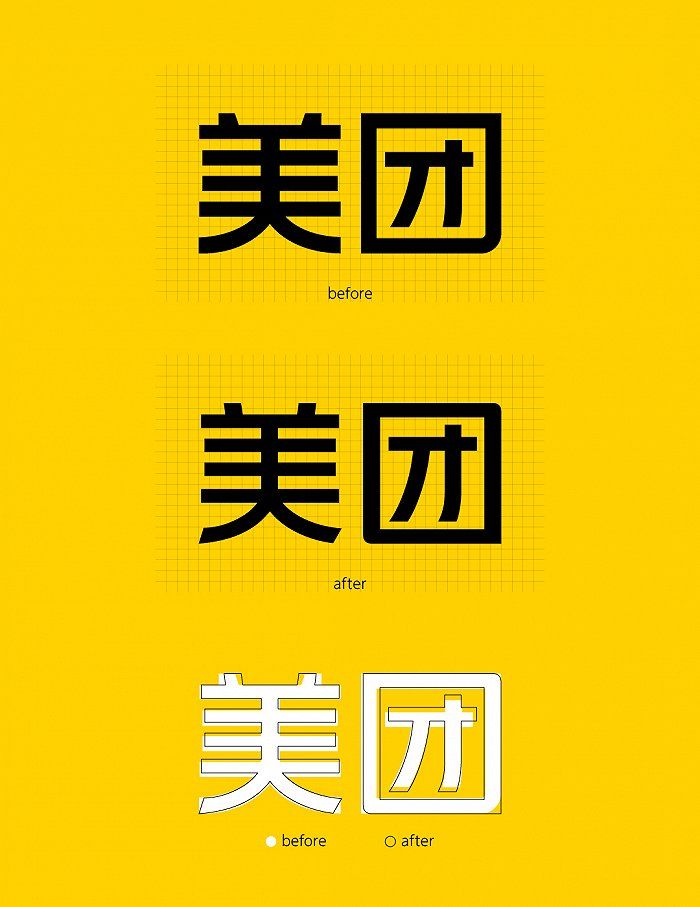 作为人们生活服务的小帮手,美团希望给人们传递温暖、亲近的感受,美团体在设计上试图还原这样一份亲和与圆融:四方笔画结构采取左下、右上双角倒圆处理,让字形方圆有致,刚柔并济,传递生活的温度。此外,高重心线的设计方式,使字体呈现出轻盈向上的挺拔姿态。
