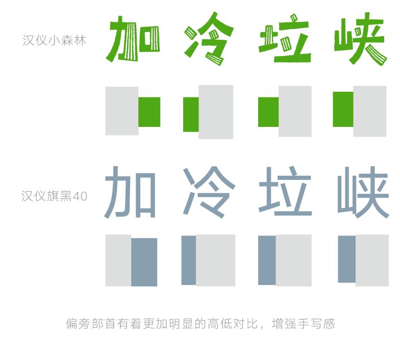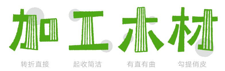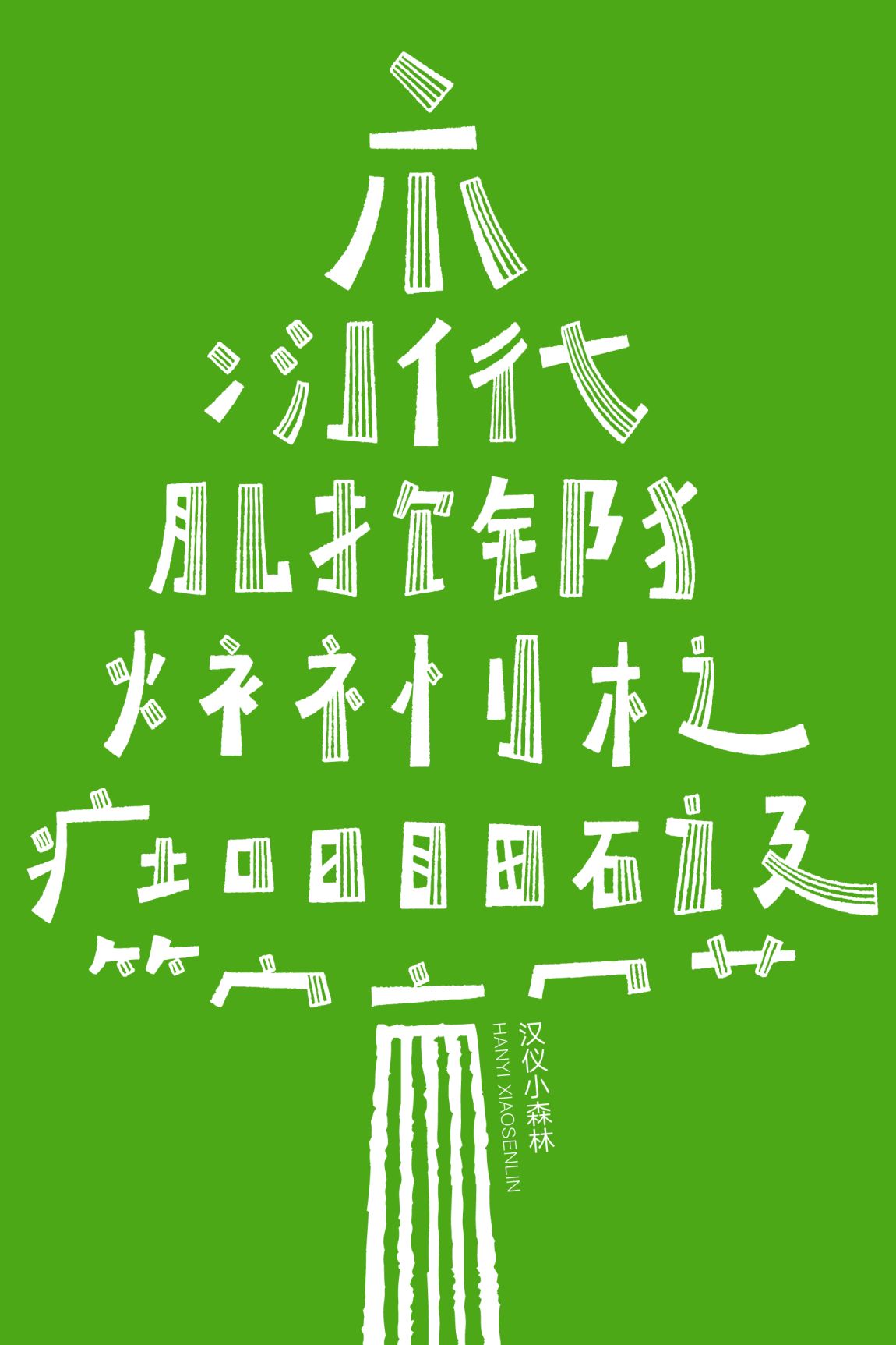 汉仪小森林采用简洁明了的笔画设计:所有笔画都由直线或曲线构成,起笔收笔平直简洁,折角明快直接,勾提笔画直角化处理俏皮可爱。