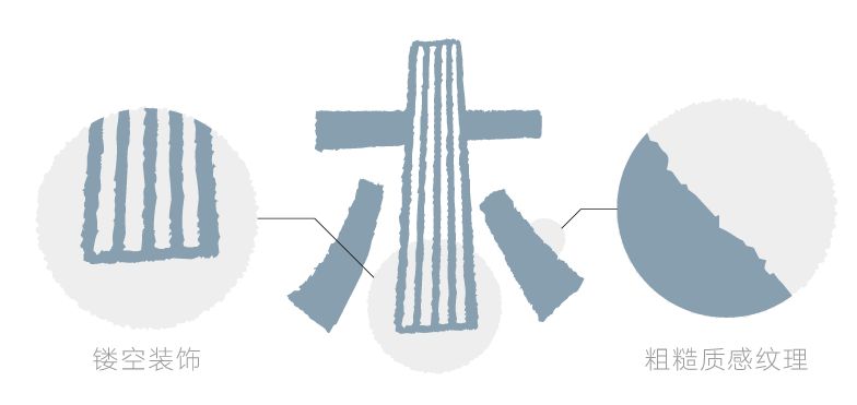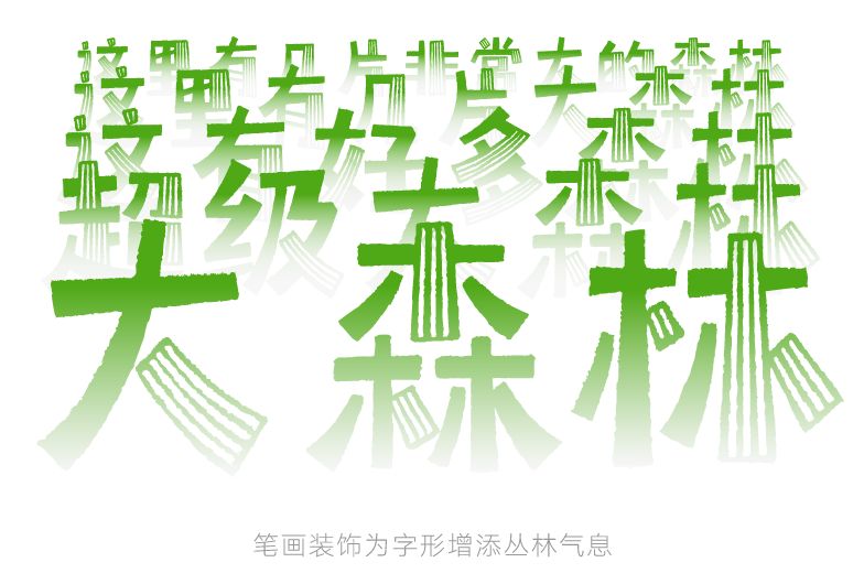 这款字体在字形的纵向主笔画上做了镂空装饰,以营造树干的肌理。笔画边缘如软嫩的泥土般粗糙有质感,以营造温馨惬意的气氛。字形排版后,能够给人走进青翠的森林一样的感受。