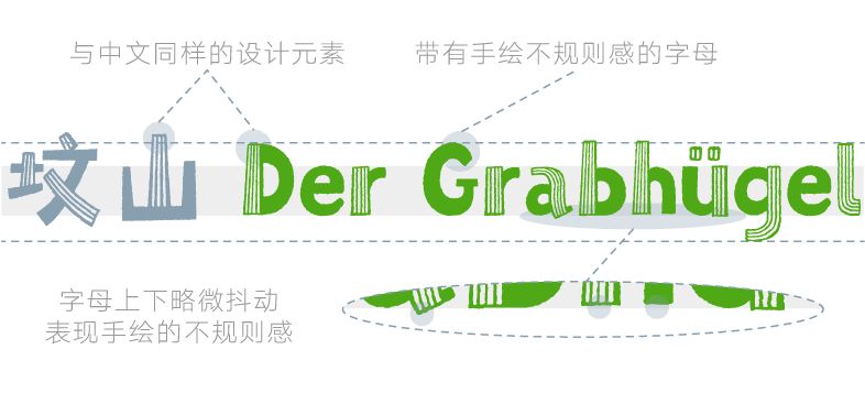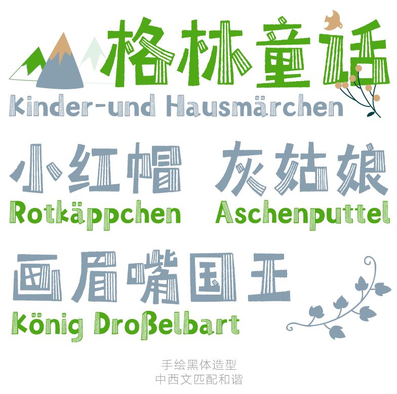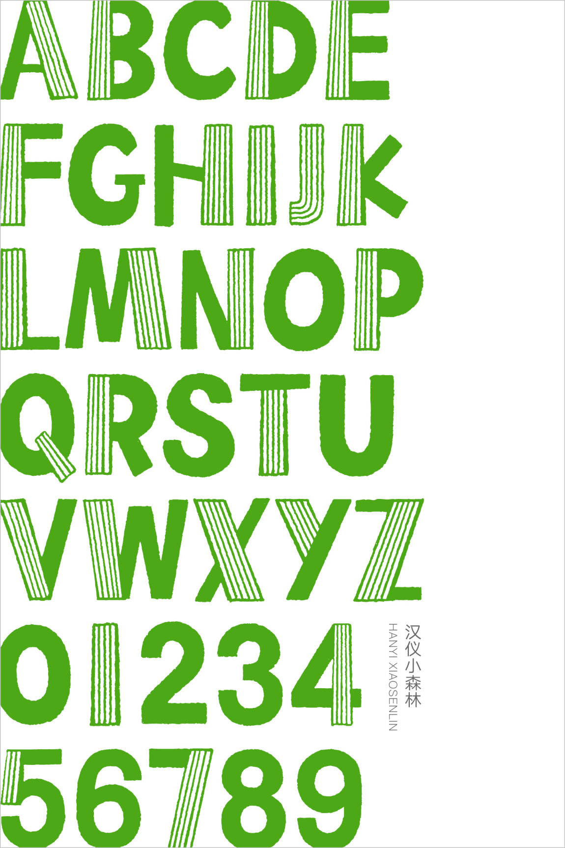 汉仪小森林的西文部分也是由设计师李佳佳绘制的。西文部分选择了带有手绘感的黑体造型,并采用与中文同样的设计手法:镂空纹理以及粗糙的肌理。西文部分在气质上比中文部分要更俏皮显可爱一些。