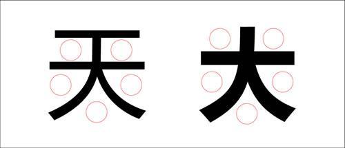 要想做大字面的字,我们首先要考虑面积最小的菱形,那么,怎样才能把菱形字做大?很简单,只要适当调整改变菱形的形状,那么,我们就能得到比原来菱形面积大的形变图形,用这种方法来设计,就可以得到在视觉上比原先字面大的字。