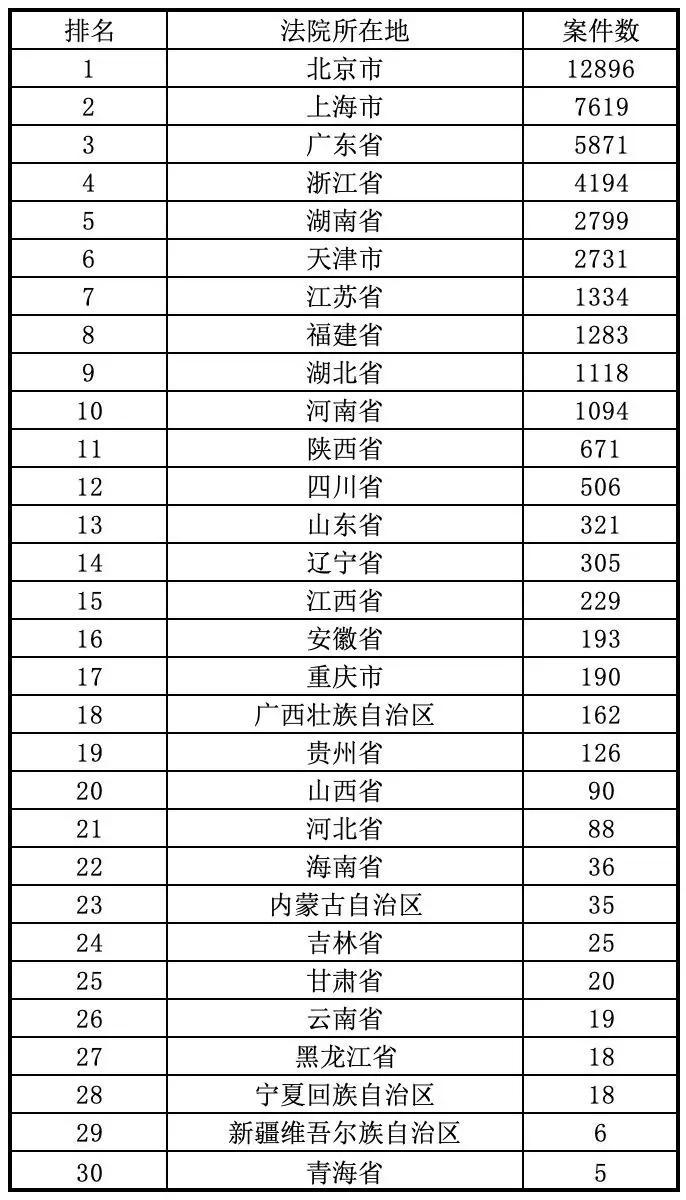 2、根据作出判决或裁定的法院所在地域,案件量分布排名如下(数据来自2019年4月10检索结果)