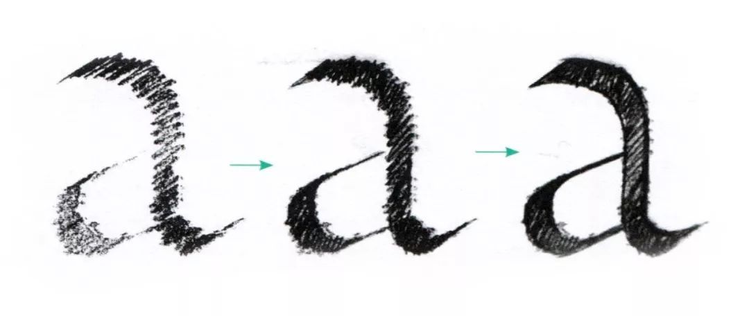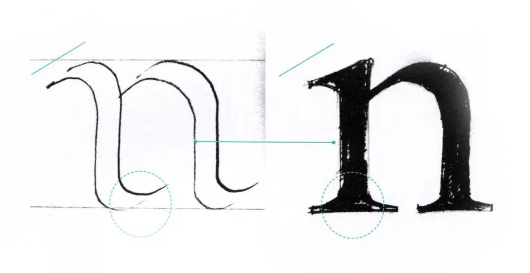 ▲笔画的起笔处转化为衬线,收笔时在字符的底部形成双衬线
