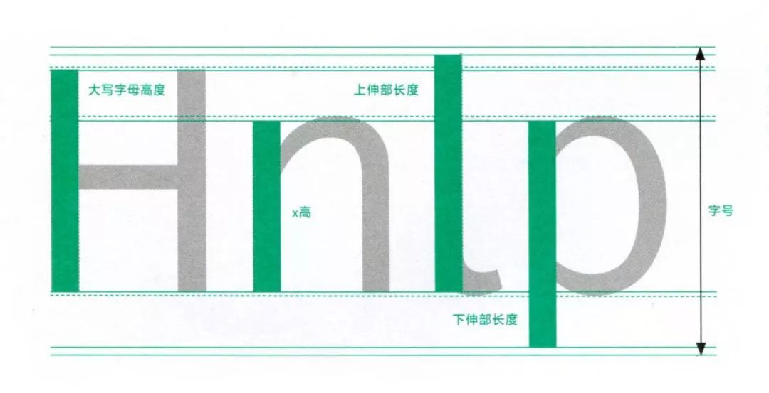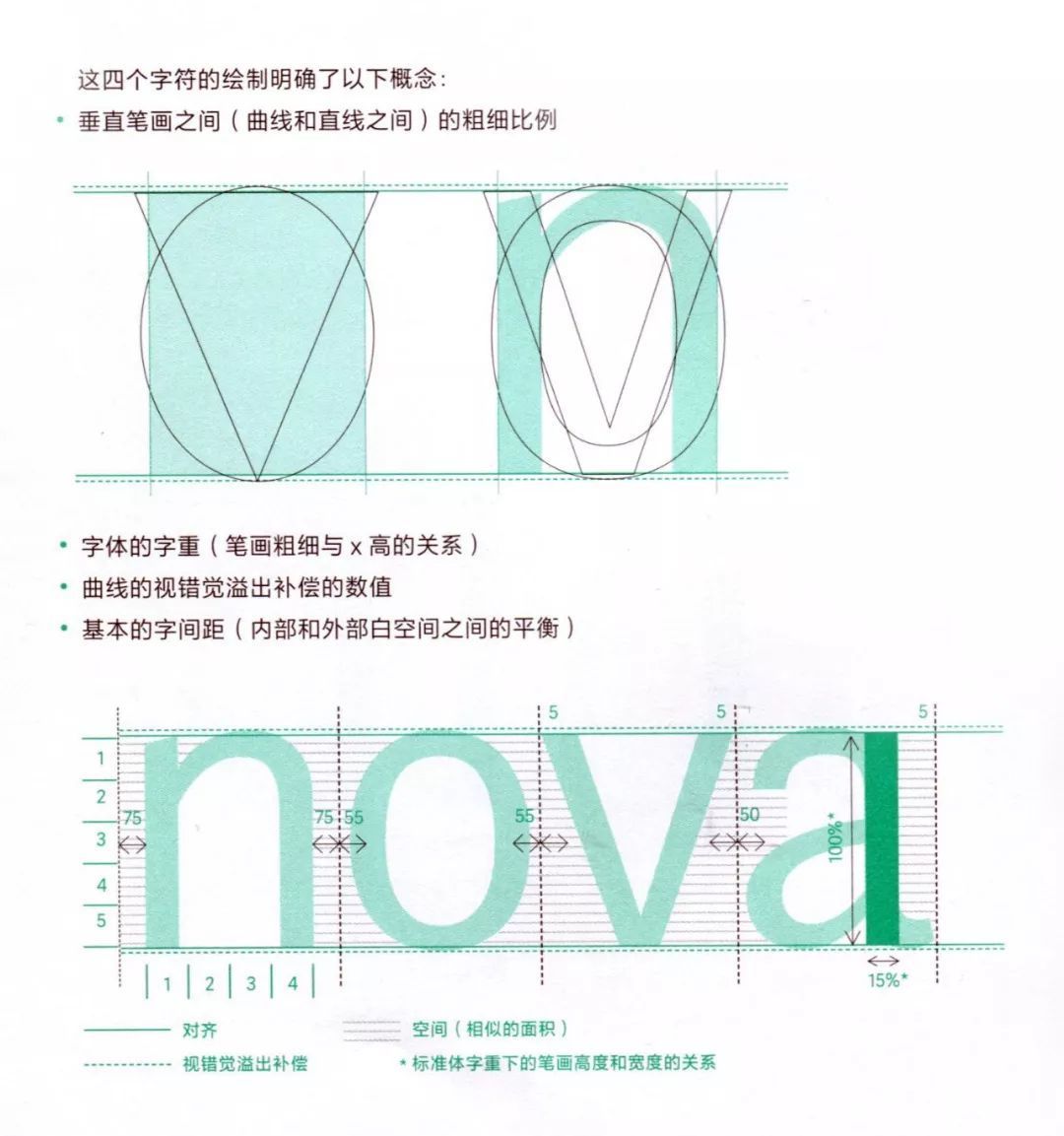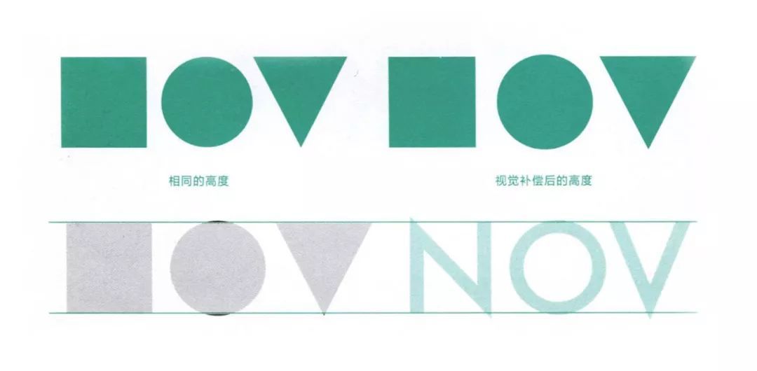 视觉调整:曲线为什么要有视错觉溢出补偿?因为当高度相同时,圆形和三角形看起来比正方形要小,因此,有必要补偿与这些形态相对应的字符,以使其与这些形态组相一致,使它们的高度看起来相同。