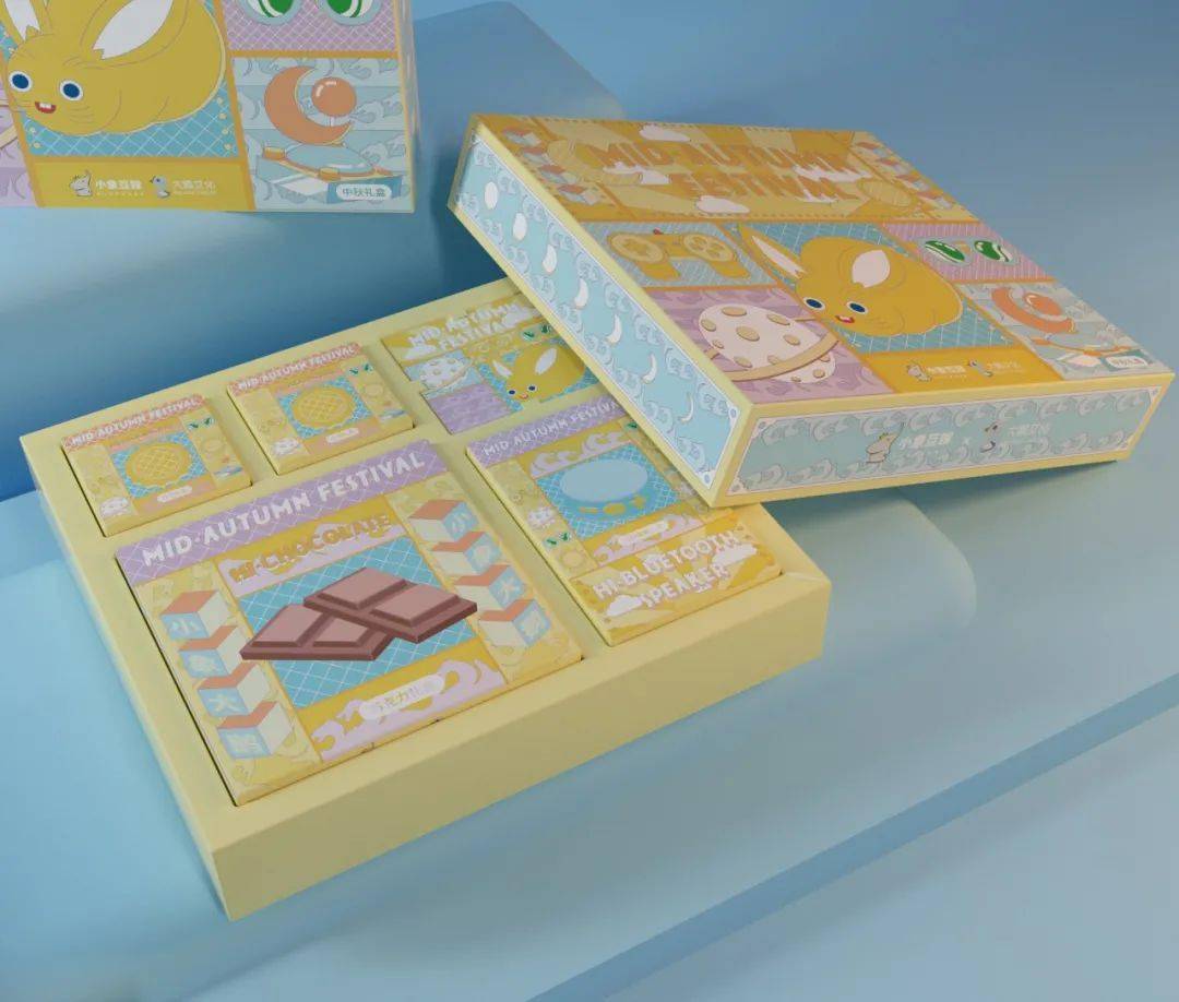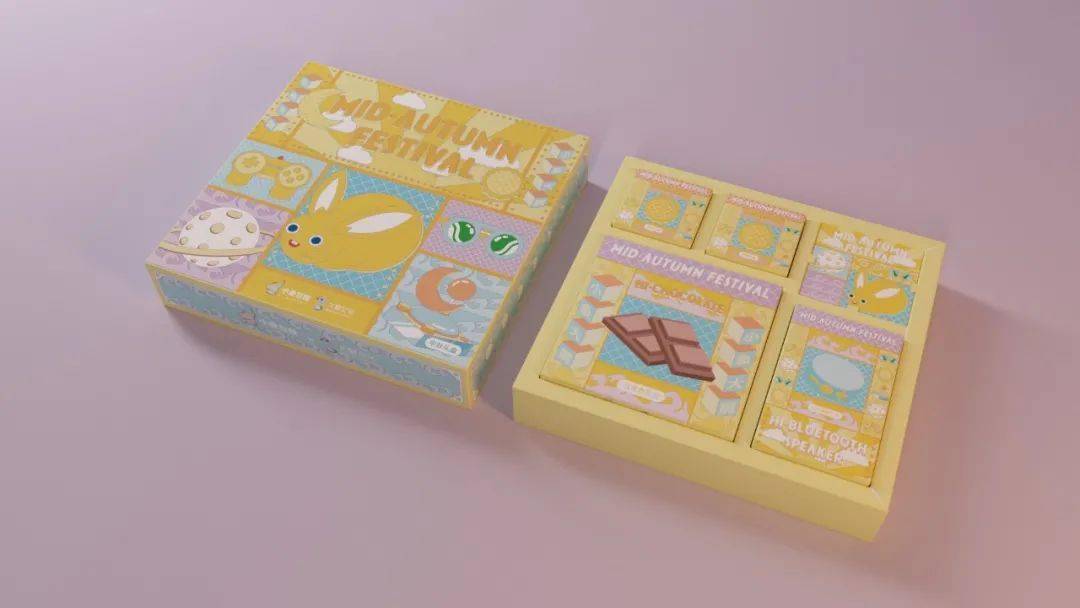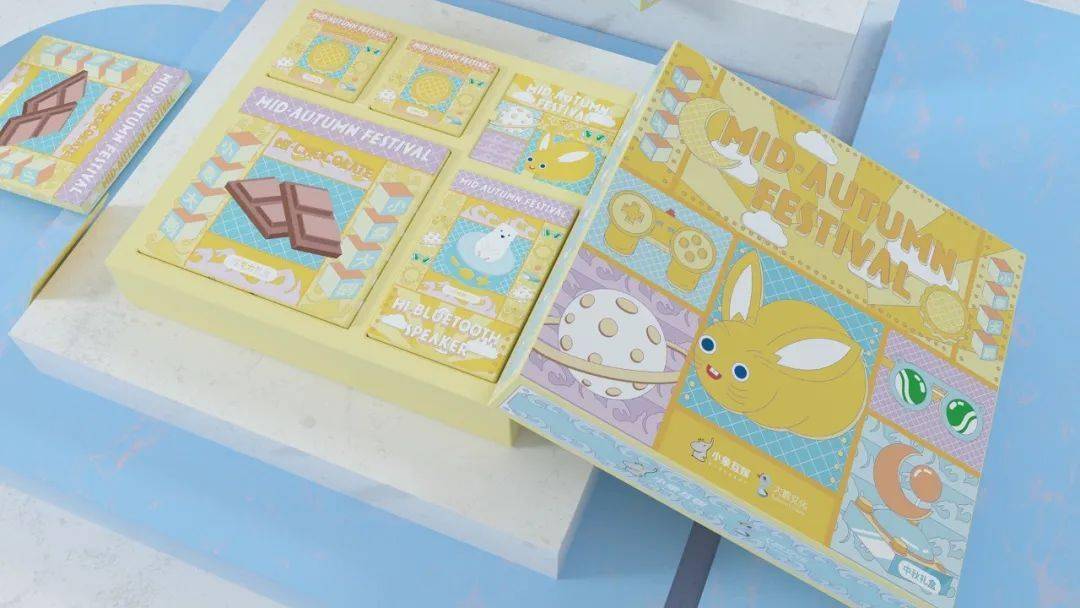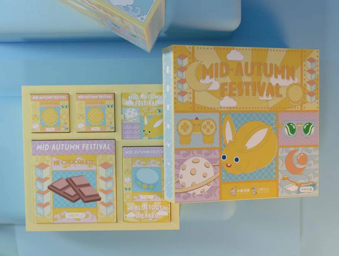 礼盒以日式风格手绘兔子手提灯笼、捧花、吃月饼、捣麻糬、喝茶在花好月圆的情境表现中秋节的佳节氛围。
