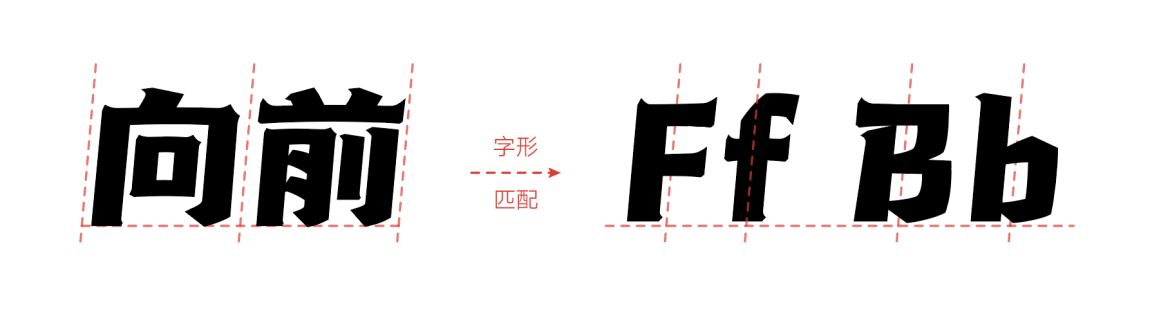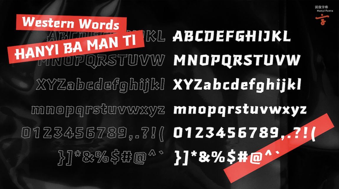 汉仪霸蛮体西文的设计来源于对中文的充分解读,从中文设计中提取了可借鉴的字形、笔画和装饰元素。