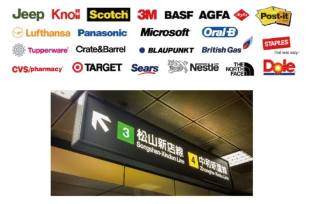 如今,Helvetica 被广泛运用于知名品牌的商标中,包含The North Face、Panasonic、3M、EPSON、HITACHI、LG、Microsoft、MOTOROLA、NBA、SUBWAY、SUZUKI、YONEX、WhatsApp 等,甚至在台北捷运的英文标示也能看到它的身影。