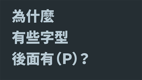 这是一个看起来不重要,但其实背后大有玄机的东西,可以让我们学到关于欧文字型的重要知识。P 可不是随便乱取名的。它的意思是 Proportional,与 monospace 是相对概念。中文字型内建的欧文字型常常良莠不齐。字型厂商常常为同一套中文字型出产两种不同版本,一个是后面有 (P) 的版本,一个是普通的版本。它们的差异,其实不在中文,而在欧文英数上面。