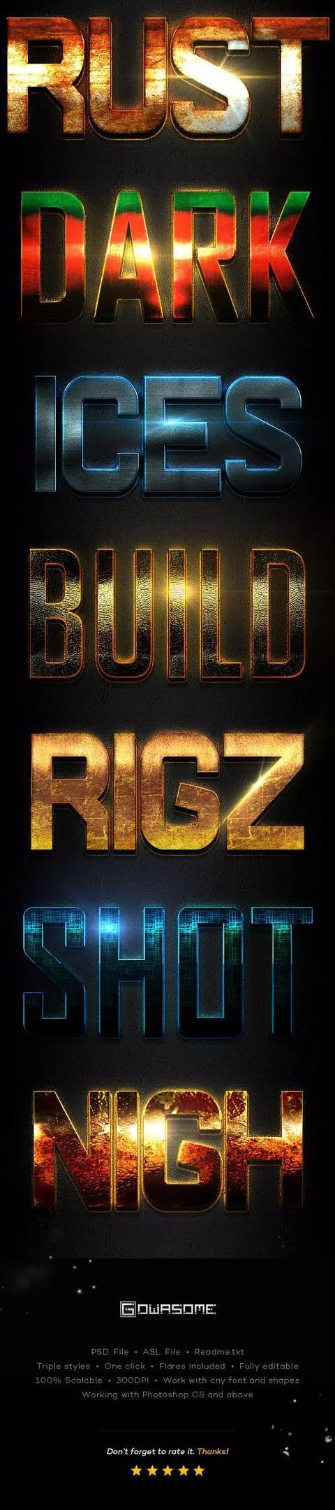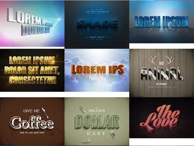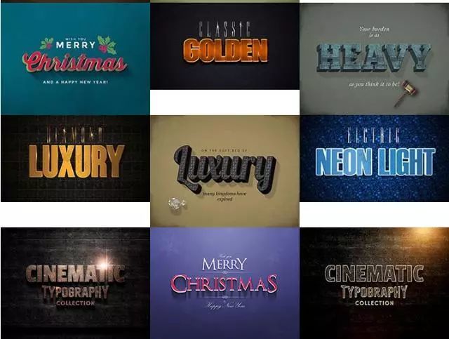包括:复仇者联盟字体效果、哥特黑暗风字体效果、黄金字体、金属特效、圣诞节字体效果、自然主题字体效果、火焰燃烧字体效果、黑板粉笔字体效果、彩色文理字体效果、复古字体效果、D立体字体效果等。