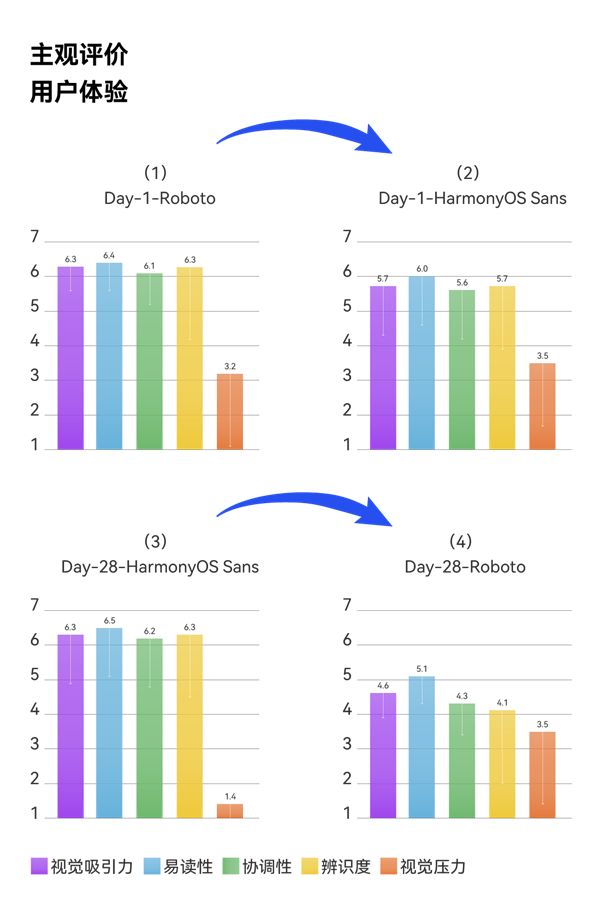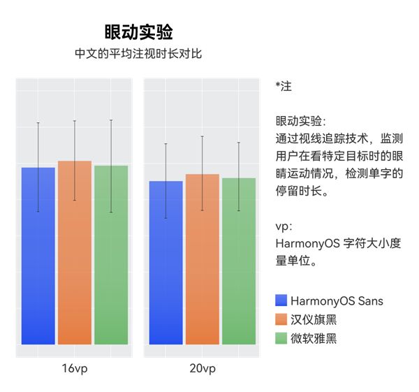 西文与Product Sans、Roboto进行对比,新字体平均注视时间均低于其他字体,HarmonyOS Sans中西文得易读性均得到了印证。