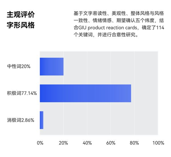 华为用户针对字形风格评价显示,用户评价高频词汇为:清晰的、中性的、优雅的、自然的、好看的、舒适的。