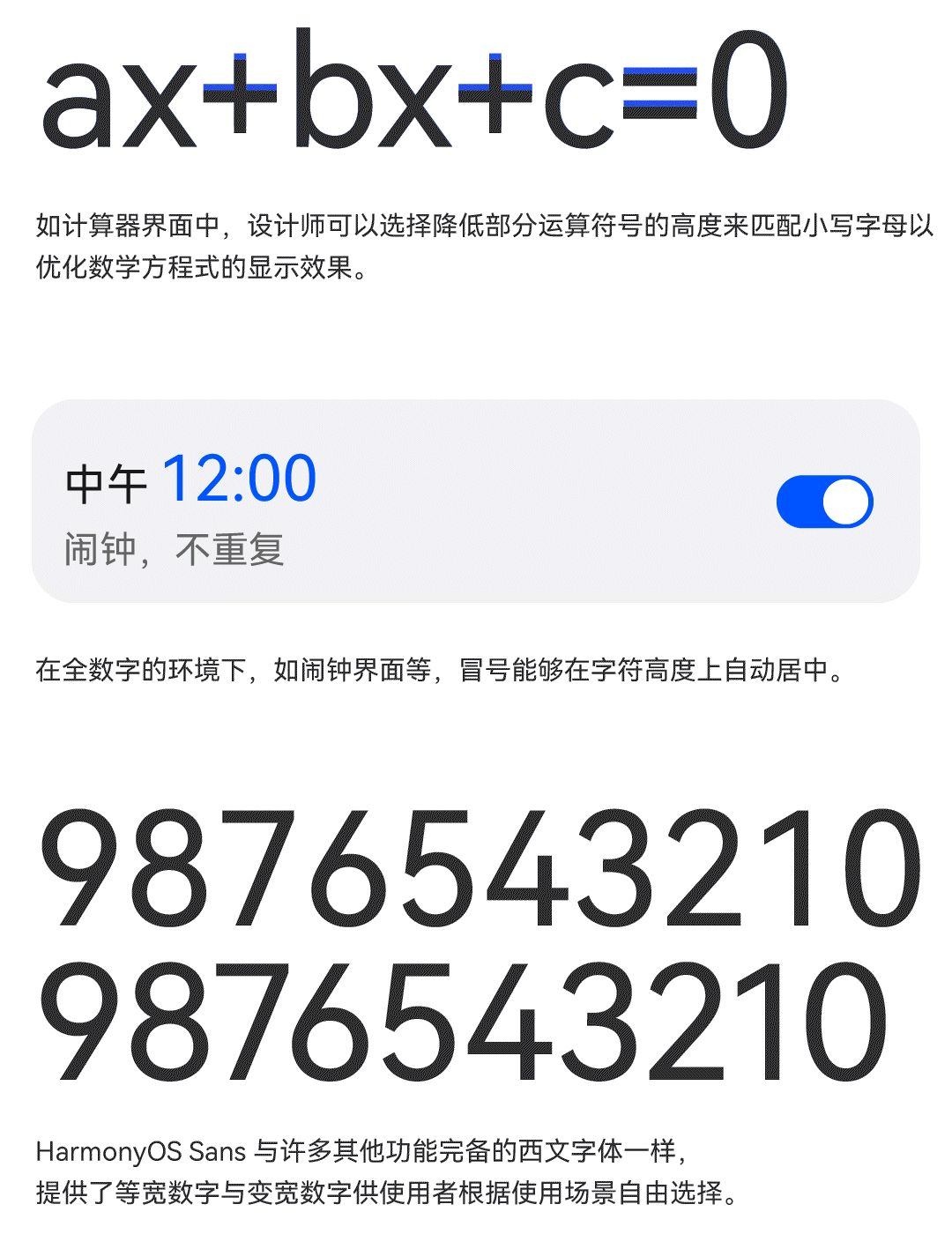 为满足用户的不同的使用场景,HarmonyOS Sans对符号设定了多种与文字相匹配的排版属性。