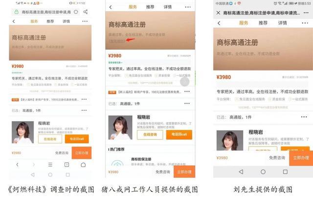 此外,《炣燃科技》曾假借客户的身份分别向猪八戒网线上、电话客服人员咨询“不成功退全款”一事,两个渠道的客服人员均未主动、明确的告知《炣燃科技》,如果出现商标注册部分驳回或复审的情况,就无法退款。