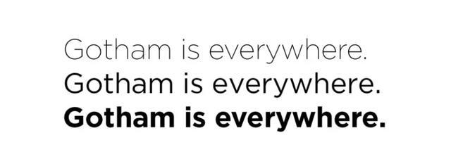 Gotham 是一款 2000 年的时候为 GQ 所设计,并于 2002 年向公众开放的字体。它出现的地方很多,从可乐瓶、推特、Spotify、Netflix、Saks 到纽约大学、翠贝卡电影节,这还不止,包括《柯南秀》和《周六夜现场》在内的电视剧、包括《盗梦空间》、《点球成金》、《可爱的骨头》和《月光男孩》在内的电影,都用到了这一字体。