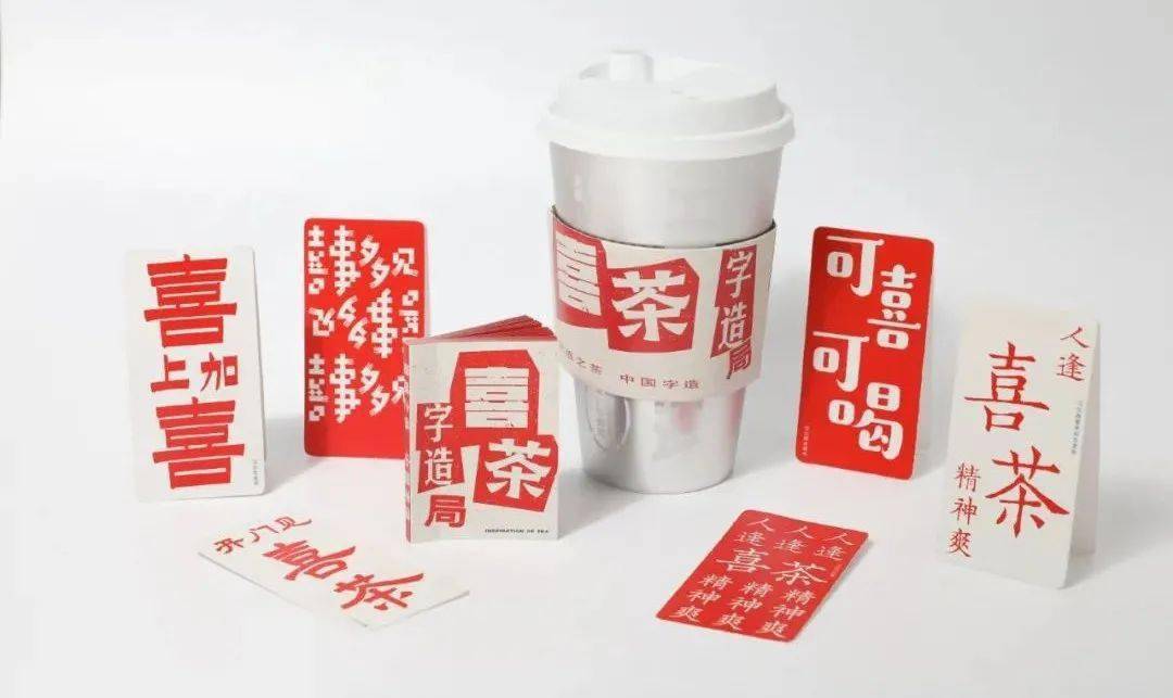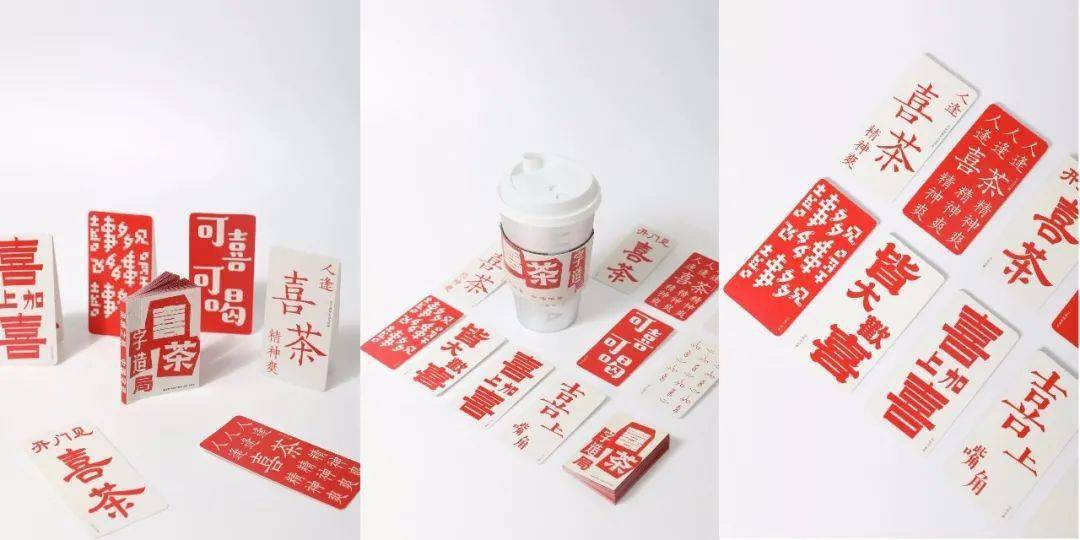 喜茶推出的这组专属字体,都是常用的熟悉字,而且“喜”字的红色与奶茶色的混搭,充分展现了喜茶品牌会玩的调性,也深得喝奶群众的一致好评: