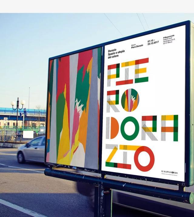 Piero Dorazio(罗马,1927年6月29日 - 佩鲁贾,2005年5月17日)是一位意大利艺术家,是意大利抽象主义的主要代表人物之一。2017年,米兰艺术画廊Il Mappamondo组织了一个专门为Dorazio设计的私人展览。Il Mappamondo委托我设计展览标识。我用彩色矩形和线条组成了名字,我的灵感来自他的画作。Dorazio也因使用颜色而闻名,因此我使用了从图片中采样的四种调色板颜色。我用PIERO的字母O替换了图片的细节,以便立即沟通。