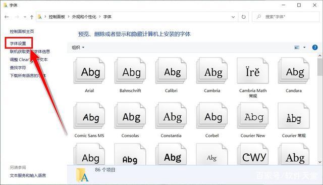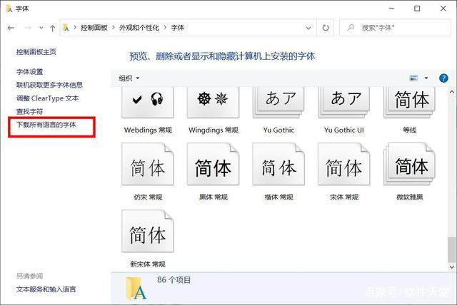 用户可以在不预览的情况下查看每种字体的外观,卸载不需要的字体并从微软官方网站下载更多字体。操作方法如下: