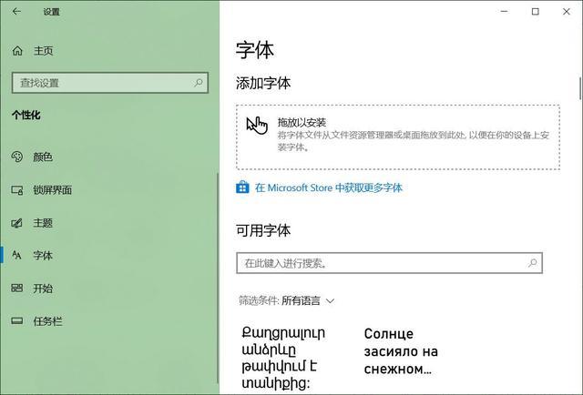只需要把下载的字体从文件资源管理器中拖放到“设置”窗口中的“添加字体”框中即可完成字体的安装。