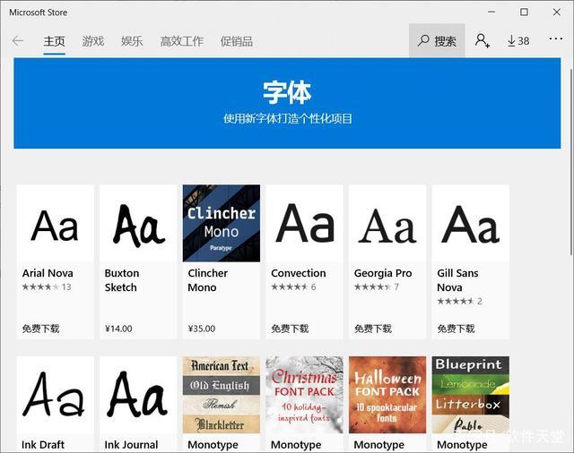 在这里,可以看到免费和高级/付费字体,可以像从商店中购买游戏或应用程序一样安装它们。单击字体,然后单击蓝色的获取按钮下载到你的计算机。
