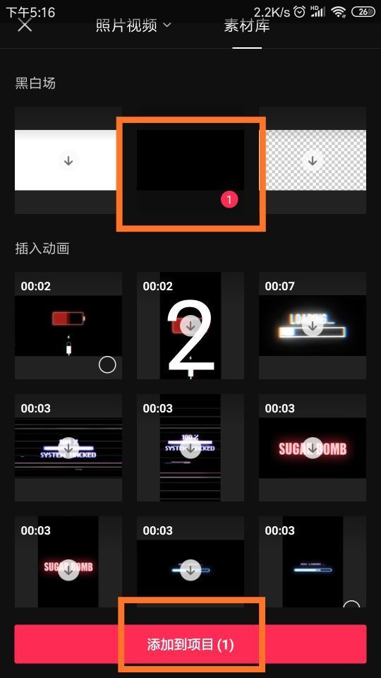 在素材库中,点击黑色背景素材,添加到项目。