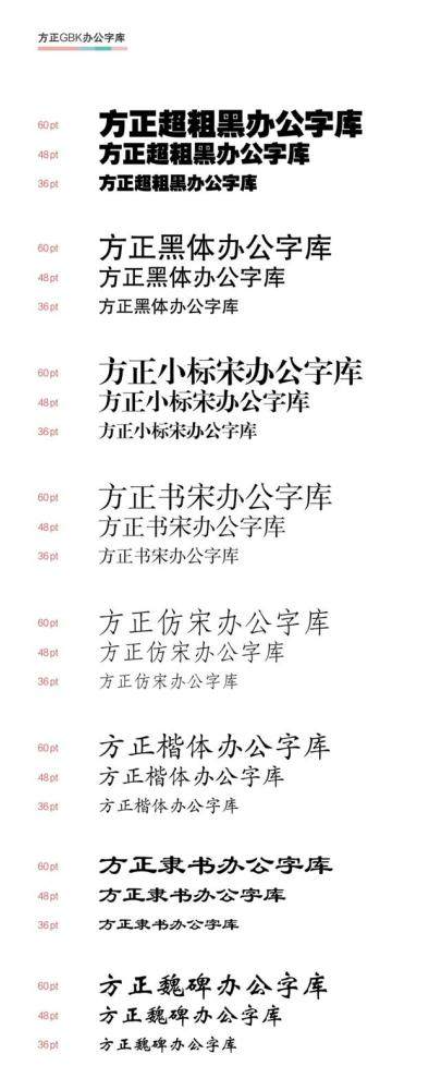 为了更好地服务于党政机关用户,提高办公用字效率,解决系统缺字难题,方正字库正式推出标准TrueType中文字库——"方正GBK办公字库"组合,包含黑体、宋体、仿宋、楷体、超粗黑、隶书、小标宋、魏碑等8款GBK字库。