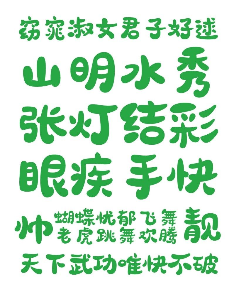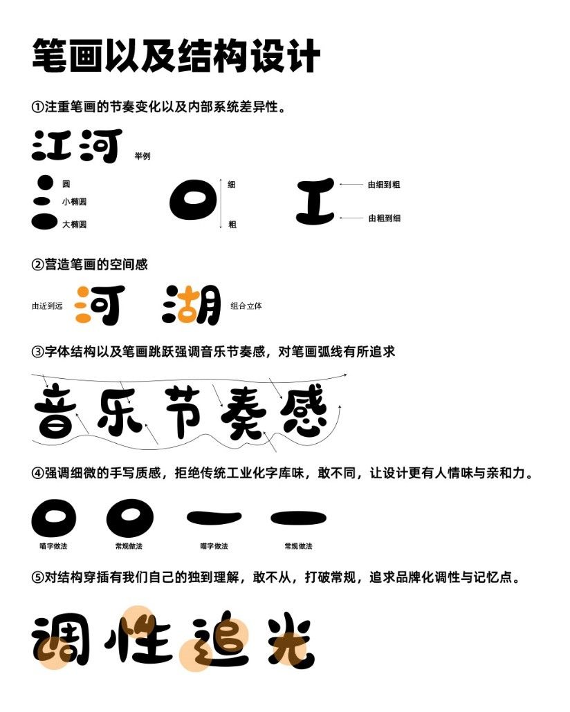 因为此套字体创作灵感来自于行书书法走势,设计团队取其部分精髓并结合当代设计师手法创作而成,专为包装行业而设计。为此,字体的设计风格“活泼、跳跃、手绘、圆润、可爱、灵动”,排版风格打破以往传统手法,注重灵活机动性。