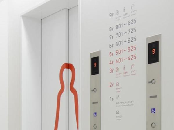 以“一小时梳洗,七小时睡眠,一小时休息”作为经营理念。广村正彰在“九小时胶囊旅馆”的导视系统中,选择极为简洁克制的视觉形态,精准呈现住宿场所需要的相关信息。他将咨询前台、索取房间钥匙、淋浴、进入胶囊房间,划分为四个步骤,以简明的图标表现在墙壁上。