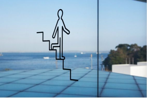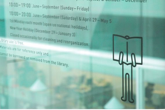 其中位于镰仓的横须贺美术馆可以看到海天之景,广村正彰的设计也因环境而生。他设计的树立在美术馆门口“海的广场”的门牌像是一面“海的镜子”,映照着由浅渐深的蓝色海天风景,并抽象成为由深浅两种蓝色组成的美术馆。而到了馆内,图书室、楼梯、寄物处甚至厕所,都有鲜明的标示指引,设计上也一別过去的既定形式,广村采用以“人”作为主题的识别,看书的人、打电话的人、上楼梯的人或者是抱奶瓶的人,像是过去洞穴壁面的象形文字般印附在简约的墙壁之上。